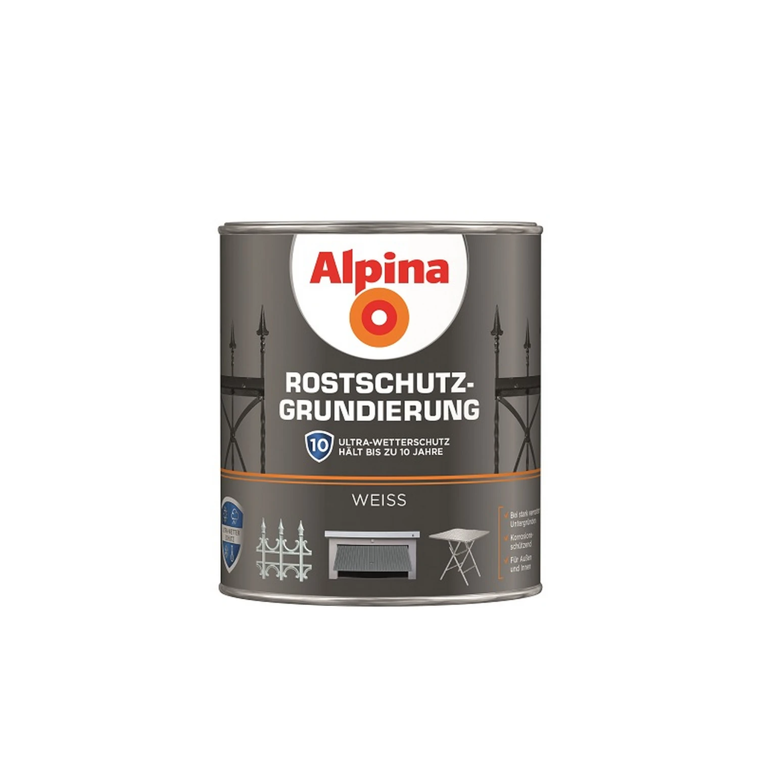 Die weiße Rostschutzgrundierung von Alpina ist umweltschonend und wasserverdünnbar. Sie dient als rostschützender Voranstrich für Eisen und Stahl. und kann auch auf stark verrosteten Untergründen verwendet werden. Dank einer speziellen Bindemittelformel ist der weiße Lack stark haftend.
