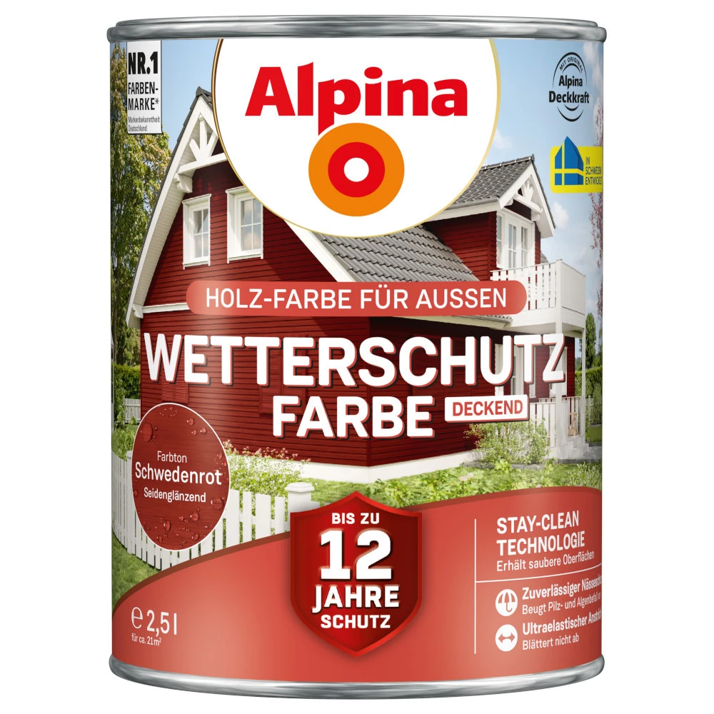 Die Alpina Wetterschutzfarbe in deckendem Schwedenrot ist eine erstklassige Wahl, um deine Holzbauteile zu Hause optimal vor der Witterung zu schützen. Mit einer Haltbarkeit von bis zu 12 Jahren bietet dieser Anstrich lang anhaltenden Schutz vor Wind, Regen, Schnee und UV-Strahlung. Die ultra-elastische Beschichtung sorgt dafür, dass der Anstrich nicht abblättert und bietet gleichzeitig einen zuverlässigen Nässeschutz. Dank seiner speziellen Rezeptur beugt Alpina Wetterschutzfarbe auch Pilz- und Algenbefall vor. Die Stay-Clean-Technologie sorgt zudem dafür, dass die Oberflächen sauber bleiben und sich Schmutz und Staub leicht abwaschen lassen. Die hochwertige Wetterschutzfarbe ist perfekt für den Außenbereich geeignet und bietet nicht nur zuverlässigen Schutz, sondern auch eine ästhetische Optik. Diese deckende Holz-Schutzfarbe verleiht beispielsweise deinem Gartenhaus einen modernen und eleganten Look. Vertraue auf Alpina, um dein Haus vor den Elementen zu schützen und es gleichzeitig optisch aufzuwerten.