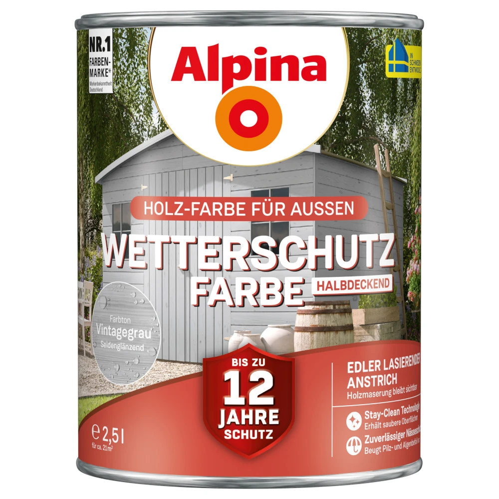 Die Alpina Wetterschutzfarbe in halbdeckendem Vintagegrau ist eine erstklassige Wahl, um deine Holzbauteile zu Hause optimal vor der Witterung zu schützen. Mit einer Haltbarkeit von bis zu 12 Jahren bietet dieser Anstrich lang anhaltenden Schutz vor Wind, Regen, Schnee und UV-Strahlung. Die ultra-elastische Beschichtung sorgt dafür, dass der Anstrich nicht abblättert und bietet gleichzeitig einen zuverlässigen Nässeschutz. Dank seiner speziellen Rezeptur beugt Alpina Wetterschutzfarbe auch Pilz- und Algenbefall vor. Die Stay-Clean-Technologie sorgt zudem dafür, dass die Oberflächen sauber bleiben und sich Schmutz und Staub leicht abwaschen lassen. Die hochwertige Wetterschutzfarbe ist perfekt für den Außenbereich geeignet und bietet nicht nur zuverlässigen Schutz, sondern auch eine ästhetische Optik. Diese deckende Holz-Schutzfarbe verleiht beispielsweise deinem Gartenhaus einen modernen und eleganten Look. Vertraue auf Alpina, um dein Haus vor den Elementen zu schützen und es gleichzeitig optisch aufzuwerten