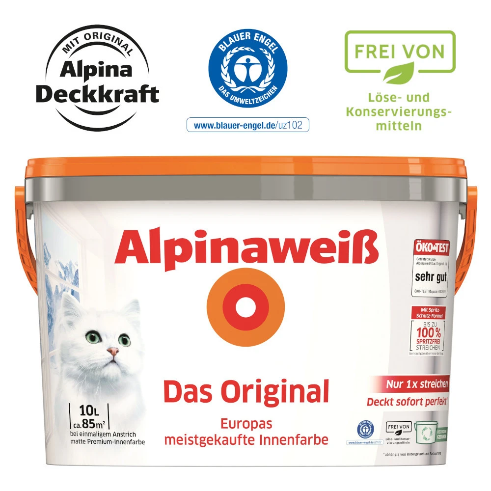 Die umweltfreundliche Alpinaweiß Wandfarbe, lässt deine Räume, mit einer stumpfmatten Oberfläche, schnell und einfach wieder erstrahlen. Die Innendispersionsfarbe wurde nach der DIN EN 13 300 angefertigt und besitzt eine äußerst hohe Deckkraft. Alpinaweiß ist eine hochwertige Wandfarbe, die höchsten Ansprüchen genügt und mit dem Umweltzeichen “Der Blaue Engel” versehen ist. Mit Spritzschutzformel, noch ergiebiger und frei von Lösungsmitteln und Konservierungsstoffen